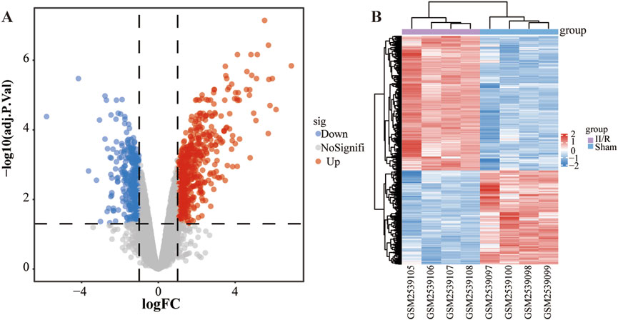 Figure 2. Identification of DEGs. (A) The volcano plot illustrates the genes that exhibit differential expression between the Sham and II/R injury samples. Red dots indicate genes that are upregulated, while blue dots correspond to downregulated genes, with established thresholds of |log2FoldChange| ≥ 1 and an adjusted P-value below 0.05. (B) The heatmap displays the differentially expressed genes between Sham and II/R injury samples. Significantly upregulated DEGs are represented in red, whereas downregulated DEGs are highlighted in blue within the samples.