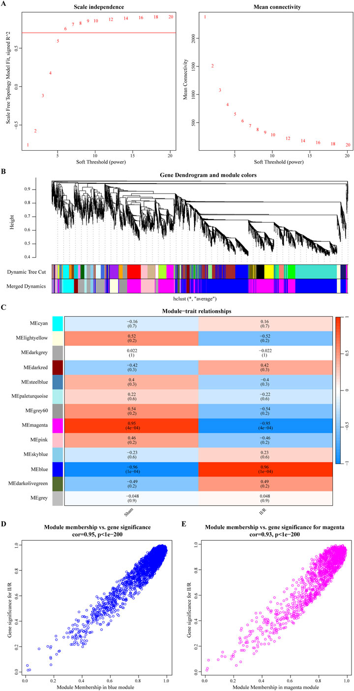 To identify co-expression modules associated with II/R injury, we performed weighted gene co-expression network analysis (WGCNA) on the GSE96733 (II/R 3 h) dataset using the “WGCNA” R package. The optimal soft threshold was selected with the “pickSoftThreshold” function to ensure a scale-free network topology. A weighted adjacency matrix was then constructed based on the Pearson correlation coefficient, from which a topological overlap matrix (TOM) was derived. Modules consisting of genes with similar expression patterns were identified with a minimum size of 30 and a merge cut height of 0.25. From these modules, genes demonstrating the strongest association with II/R injury were subsequently extracted for further analysis (Zeng et al., 2023).