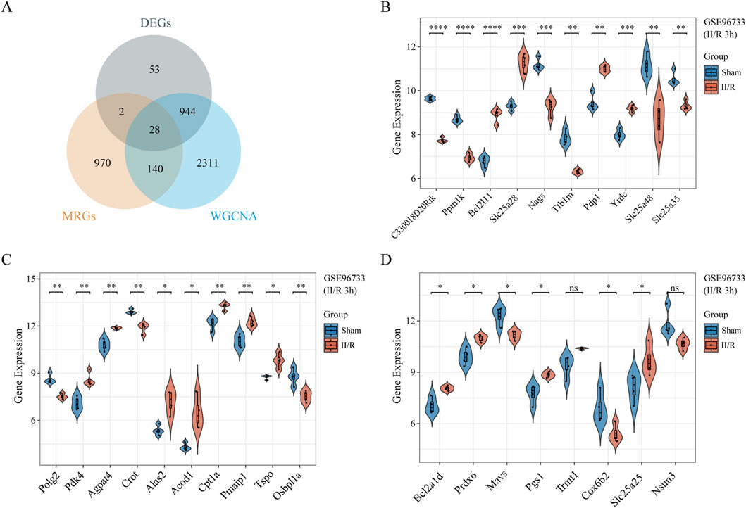 Figure 4. Identification of DEMRGs. (A) Venn diagram of DEMRGs between MRGs, DEGs, and the most relevant modules from WGCNA. (B–D) Violin plot illustrate the differential expression of 28 mitochondrial-related genes in both II/R and Sham samples. P-Values were calculated using t-test. The significance levels indicated as follows: *P < 0.05; **P < 0.01; ***P < 0.001; ****P < 0.0001. ns, not significant.