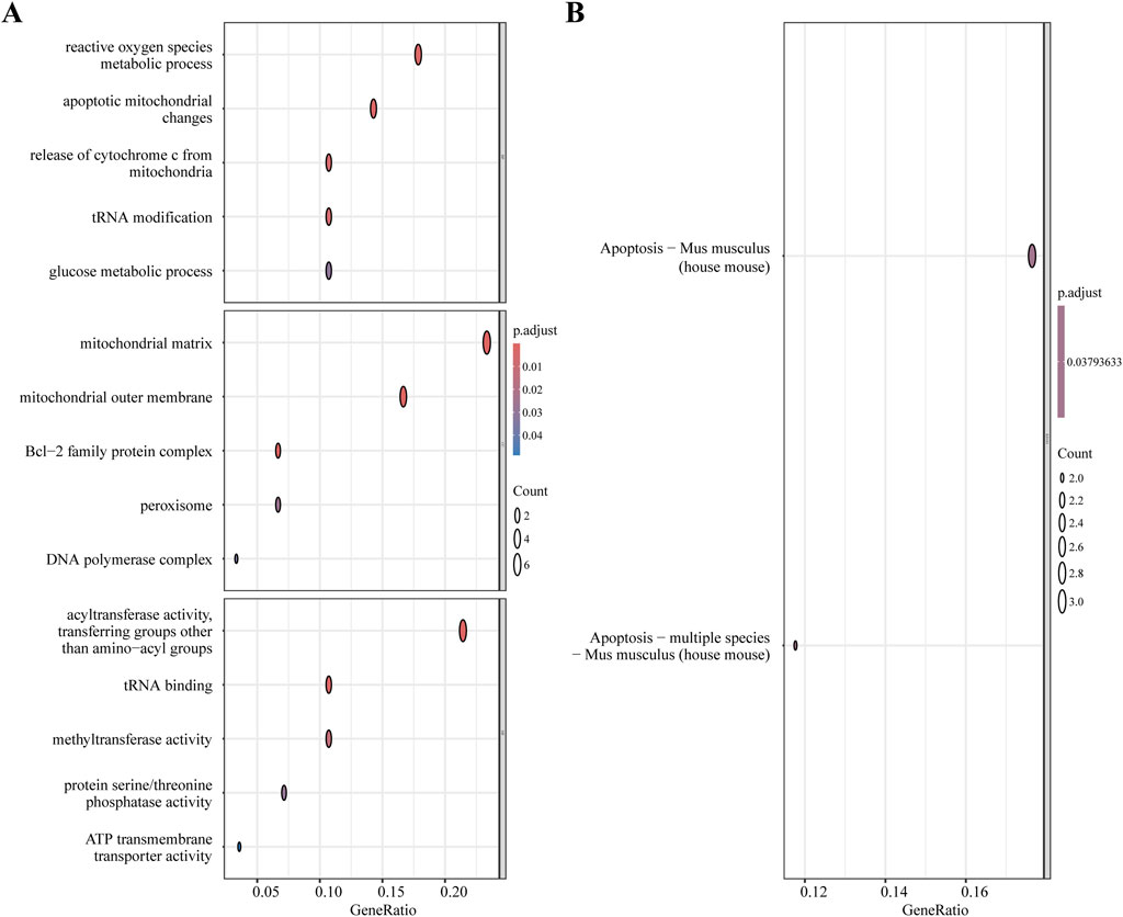 Figure 5. Functional enrichment analysis of DEMRGs. (A) GO enrichment results of DEMRGs. (B) KEGG enrichment results of DEMRGs.