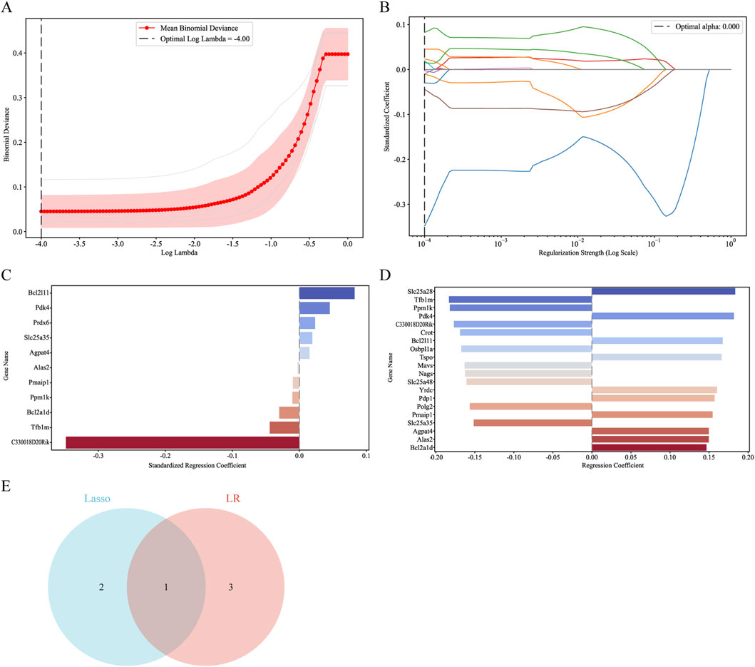 Figure 7. Screening for hub genes by machine learning algorithms. (A–C) Hub genes identified using the least absolute shrinkage and selection operator (Lasso) logistic regression algorithm. (D) Logistic Regression (LR) algorithm to screen hub genes. (E) Venn diagram demonstrating overlapping hub gene screened by Lasso and LR.