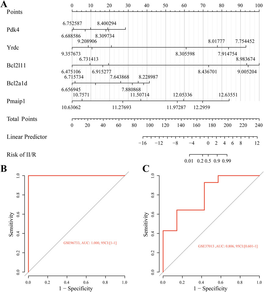 Figure 8A shows the nomogram we developed using five identified hub genes—Pmaip1, Bcl2a1d, Bcl2l11, Yrdc, and Pdk4—as possible diagnostic indications for predicting II/R injury. Assessment of diagnostic performance using ROC curves yielded a flawless area under the curve (AUC of 1.0) for the training cohort, presented in Figure 8B. Furthermore, the GSE37013 dataset was used to validate the prediction model’s efficacy. The diagnostic model demonstrated robust predictive performance for II/R injury, achieving an AUC of 0.806 (95% CI: 0.601–1.000) (Figure 8C). Nonetheless, this diagnostic paradigm has to be further investigated in forthcoming clinical trials in order to determine its accuracy and reliability. For information, refer to Supplementary Table S5.