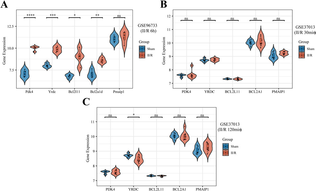 Figure 9. Validation of hub genes expression in other datasets. (A–C) The expression levels of Pmaip1, Bcl2a1d, Bcl2l11, Yrdc, and Pdk4 were verified by GSE96733 (II/R 6 h), GSE37013 (II/R 30 min), and GSE37013 (II/R 120 min) datasets, the results of which are presented as violin plot. P-Values were calculated using t-test. The significance levels indicated as follows: *P < 0.05; **P < 0.01; ***P < 0.001; ****P < 0.0001. ns, not significant.