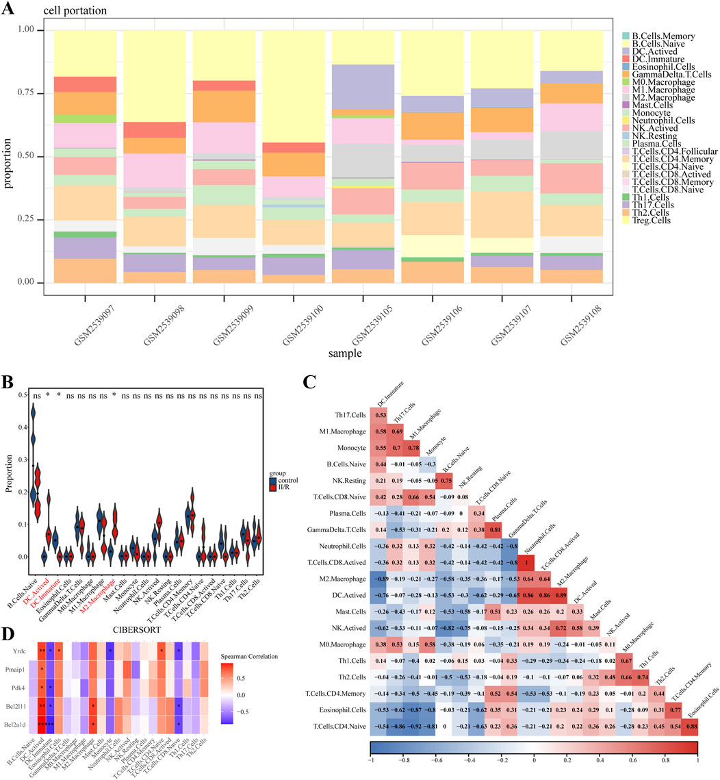 Figure 10. Results of immune cell analysis. (A) The histogram indicates the relative proportions of 25 immune cells. (B) Violin plot illustrating the relative expression of each immune cell subtype between Sham and II/R injury samples. (C) The correlation heatmap shows the relationships among various immune cells. (D) Heatmap showing the correlation between immune cells and five hub genes. *P < 0.05; **P < 0.01.