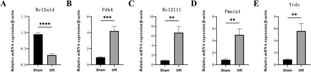 Figure 11. The expression levels of hub genes in the mouse II/R injury model. (A–E) The mRNA levels of Pmaip1, Bcl2a1d, Bcl2l11, Yrdc, and Pdk4 were assessed using qRT-PCR. *P < 0.05, **P < 0.01, ***P < 0.001, ****P < 0.0001. ns, not significant.