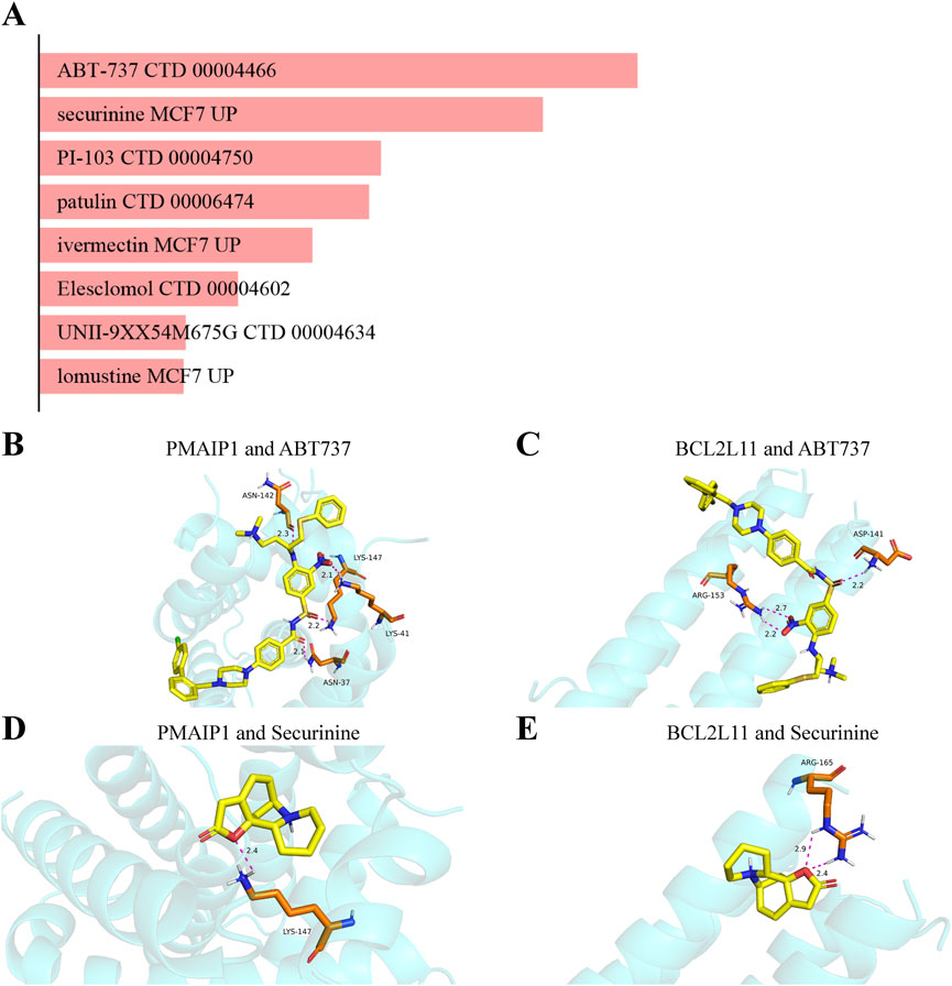Figure 13. Analysis of candidate drugs and molecular docking targeting mitochondrial-related genes for the prevention of intestinal II/R injury. (A) Summary of candidate drugs identified from the DSigDB database. (B,C) Molecular docking visualization of ABT737 with BCL2L11 and PMAIP1. (D,E) Molecular docking visualization of Securinine with BCL2L11 and PMAIP1.