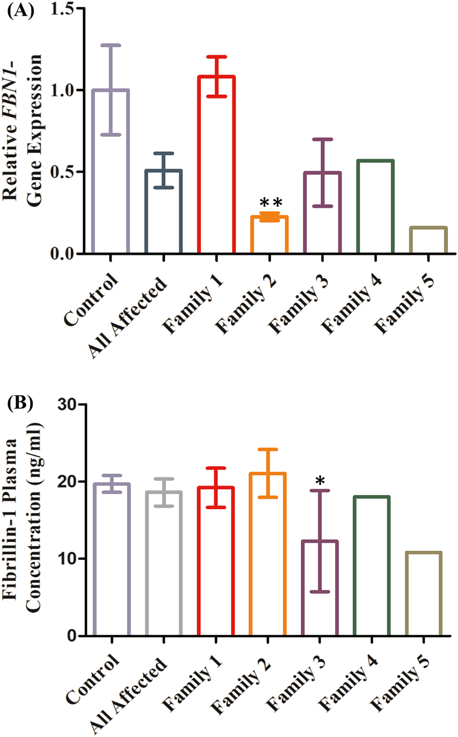 Figure 5. Quantitative assessment of the identified variants. A comparison of FBN1 expression between the controls and all the affected members from the five families shows that the expression decreased by 50% compared to that in the control (A). A comparison of FBN1 expression between the controls and affected members from family 1 indicated almost equal expression with a slight increase of 8%. A significant reduction in gene expression of 77% was identified in family 2 compared to that in controls (p-value = 0.0038). A comparison of FBN1 expression between the controls and the affected members from family 3 revealed a 50% decrease. For the affected members in families 4 and 5, a reduced gene expression by 43% and 85% was observed in the two families, respectively. A comparison of fibrillin-1 concentration between the controls and all the affected members from the five families shows that the expression is almost similar in both groups, with a slight decrease of 5.58% (B). For individual families, the affected members in family 1 carrying the nonsense variant FBN1:c7180C>T exhibited fibrillin-1 levels almost equal to that of the control with a mild decrease of 2.5%. Similar findings were observed in family 2 with the frameshift variant FBN1:2142-2143delGC, with a 7% increase, while fibrillin-1 concentration in family 3 with the missense variant FBN1:c.209G>T was significantly reduced by 37.61% compared to that in the control (p-value = 0.0256). In families 4 and 5, fibrillin-1 levels were decreased by 8.4% and 45%, respectively.
