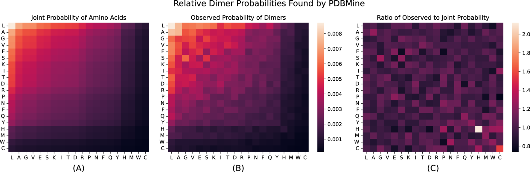 Figure 5. (A) Shows the joint probability of Dimers solely based on the observed probability found for each acid acid independently:
