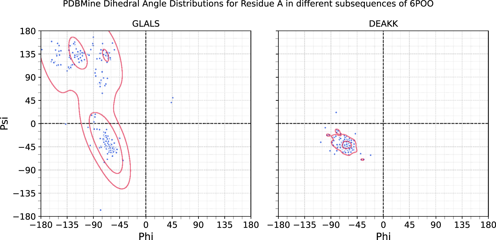 PDBMine offers unique insights into the statistics of dihedral angles for -mer sequences across the PDB. Given a short amino acid subsequence consisting of a residue of interest (e.g., the center residue) and its surrounding residues, PDBMine can be queried using Method 2 to find full length matches of the subsequence. The distribution of dihedral angles for the residue of interest is contextualized by its neighboring amino acids; this set of context-specific dihedral angle distributions represents a restricted R-space.