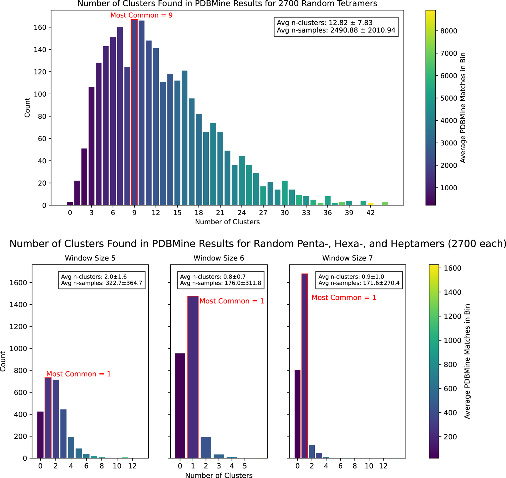 We hypothesized, however, that the majority of these potential clusters are not exhibited in the PDB—as in, certain combinations of individual clusters in a subsequence do not occur. The clusters that are represented then serve as baselines for what dihedral angles and, in turn, 3D conformations, are possible for different amino acid sequences. To gain insight into the behavior of these clusters, we applied Algorithm 1 to a large sample size of short amino acid sequences. For each in , 2,700 -mers were randomly extracted from the amino acid sequences of a set of proteins from PDB (10.8k total sequences). PDBMine was queried for each, and the results were clustered by Algorithm 1. For each -mer, the number of matches found by PDBMine and the number of clusters found by Algorithm 1 were recorded.