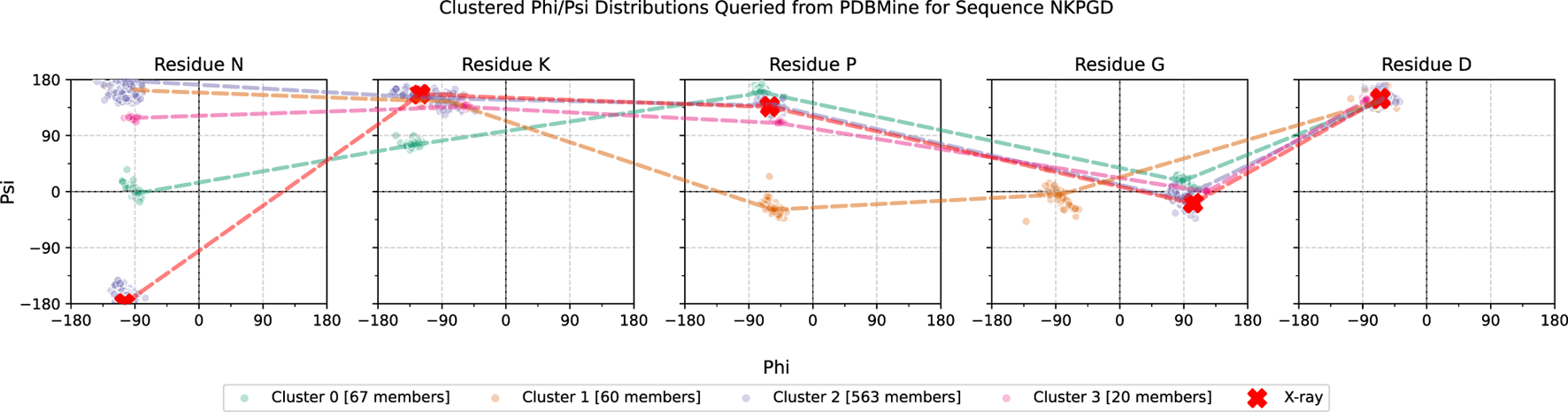 In general, two approaches can be conceived to implement the sequence and structural constraints described in Equation 4. The first approach is to impose the constraints during the course of querying PDBMine’s database. The second approach is to utilize data analytics to organize and the results after querying. Since the first approach is computationally intensive, we adopt the second. More specifically, this approach involves clustering dihedral tuples from each fragment in a high-dimensional space. For example, for a window size of 5, each matching fragment found by PDBMine would contain pairs of dihedral angles, resulting in 10 total values. In prior methods, these angles are typically analyzed as five independent 2D distributions–one per residue–to study the target residue’s conformational preferences. However, they can also be interpreted jointly as 10-dimensional data points, with each fragment represented as a single vector. Clustering these vectors in high-dimensional space allows us to identify dominant structural motifs associated with the given pentameric sequence.