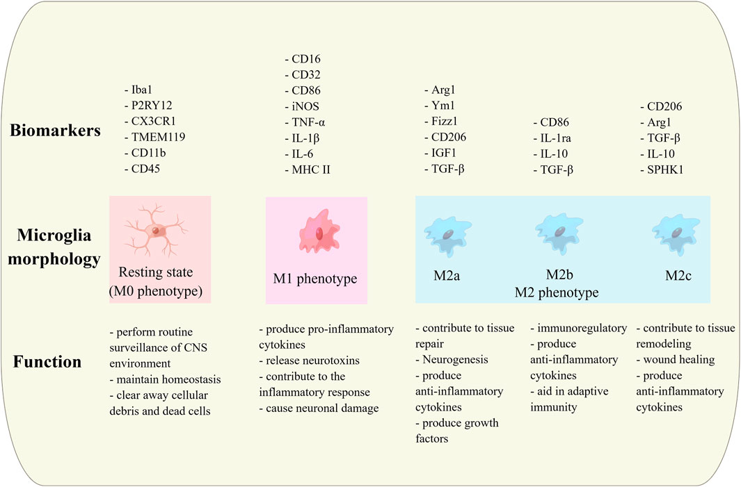 Historically, microglial activation was simplified into two phenotypes: the “classic” pro-inflammatory M1 and “alternative” anti-inflammatory M2 states, representing extremes of microglial activation (Orihuela et al., 2016; Ransohoff, 2016a). However, it is now widely recognized that microglial activation is highly dynamic and context-dependent, with microglia adopting various activation states in response to different stimuli (Deczkowska et al., 2018). These activation states are characterized by specific gene expression profiles, functions, and secreted factors that can be either neuroprotective or neurotoxic (Bachiller et al., 2018; Spiteri et al., 2022). In general, resting-state microglia assist neuronal circuit formation and induce neuroactive synaptic plasticity by phagocytosing neuronal fragments (Nayak et al., 2014; Cornell et al., 2022). Microglia M1 are neurotoxic phenotype, as they release pro-inflammatory cytokines and various neurotoxins, such as IL-1β, IL-6, TNF-α, which may damage neurons and even induce neuronal death (Tang and Le, 2016). In M1 activation state, microglia can initiate a pro-inflammatory response, producing pro-inflammatory factors to eliminate foreign pathogens and promote an adaptive immune response (Tang and Le, 2016; Kwon and Koh, 2020). On the contrary, microglia M2 are neuroprotective phenotype, as they release neurotrophic factors promoting neuronal growth and tissue repair, such as IL-4, IL-10, BDNF, which protect neurons (Kwon and Koh, 2020). M2 forms can be further classified into M2a, M2b and M2c subtypes, where M2a could counteract neuroinflammation by secreting IL-10 and various neurotrophic factors to attenuate the pro-inflammatory response and stimulate tissue repair. M2b are associated with increased phagocytic and immunomodulatory activity and secrete large amounts of the anti-inflammatory factor IL-10 as well as the pro-inflammatory factors IL-1β, IL-6 and TNF-α. M2c secrete IL-10 and TGF-β and are associated with anti-inflammatory effects, tissue repair and neuronal debris removal (Orihuela et al., 2016; Pepe et al., 2014; Guo et al., 2022). During acute stimulation, the activation of microglia is primarily M2 phenotype, which is beneficial for neuronal survival. However, during chronic stimulation, the activation of microglia is primarily M1 phenotype, which promotes neuronal degeneration and death (Salter and Stevens, 2017; Mariani and Kielian, 2009; Orihuela et al., 2016).