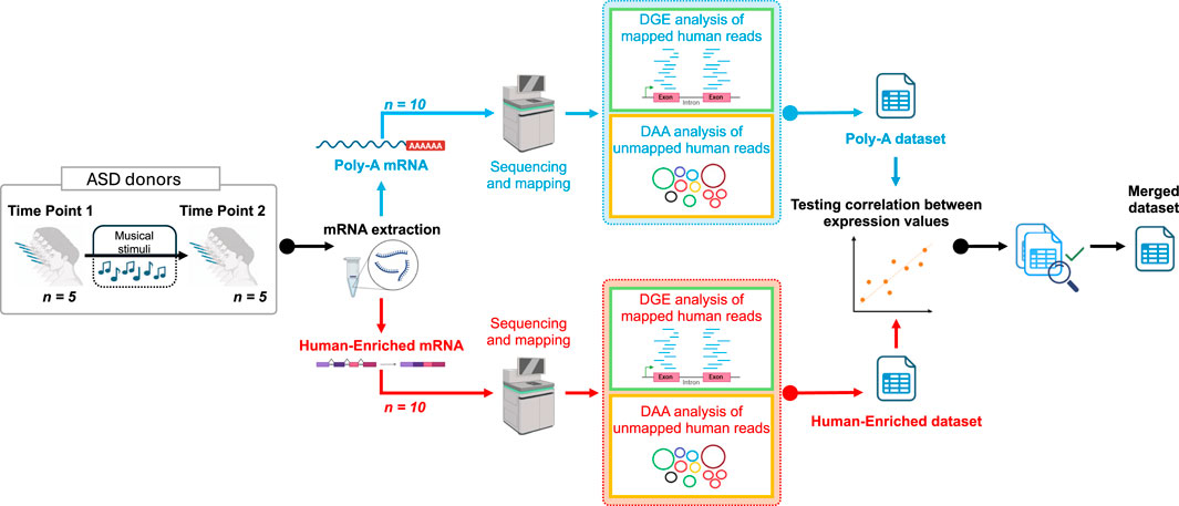 Workflow diagram of ASD donors at two time points with musical stimuli. mRNA extraction transfers Poly-A and Human-Enriched mRNA for sequencing and mapping. Poly-A dataset undergoes DGE analysis of mapped reads, while both datasets undergo DAA analysis of unmapped reads. Poly-A and Human-Enriched datasets are tested for expression value correlation, resulting in a merged dataset.