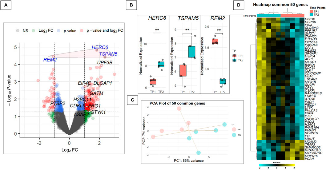 Panel A shows a volcano plot with Log2 fold change on the x-axis and negative Log₁₀ P-value on the y-axis, highlighting significant genes such as REM2, HERC6, and TSPAN5. Panel B presents box plots of normalized expression for HERC6, TSPAN5, and REM2 at two time points (TP1 and TP2). Panel C is a PCA plot of 50 common genes, with PC1 explaining 86% and PC2 7% of the variance. Panel D features a heatmap of 50 common genes, with clustering by time points TP1 and TP2, displaying varying expression levels.