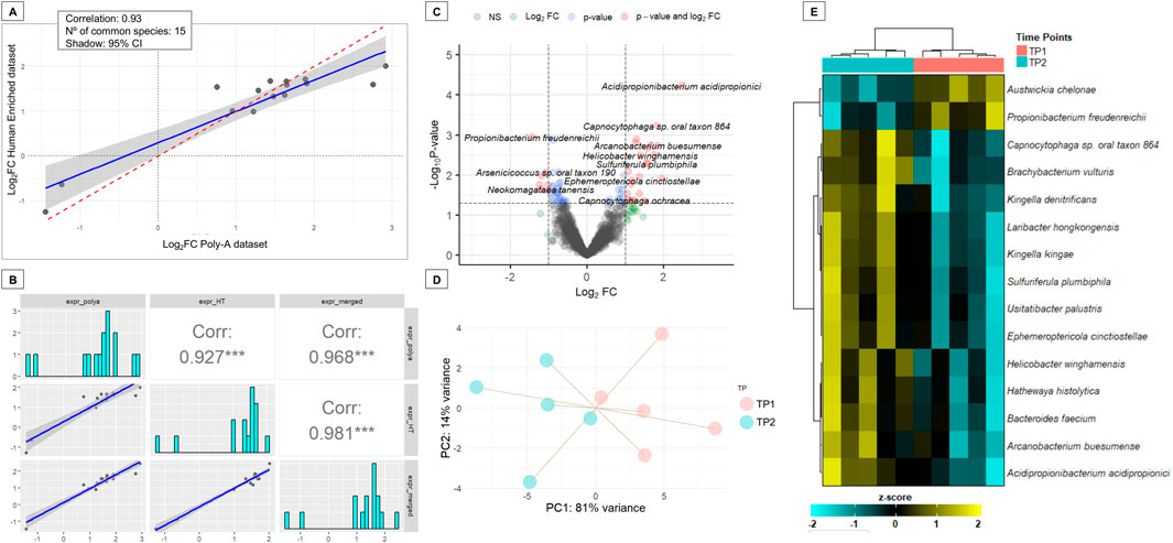 Differential abundance analysis (DAA) was conducted using DESeq2 in the two datasets separately. No bacterial species passed the adjusted significance threshold (adjusted P-value <0.05) in either dataset. However, 52 species in the Human-Enriched dataset and 62 in the Poly-A dataset showed nominal significance (P-value <0.05), with 15 species overlapping between the two datasets (Supplementary Table S12). A Pearson correlation analysis of the Log2FC for these 15 shared species revealed a high concordance (r = 0.93), indicating strong agreement between the independent analyses (Figure 7A).