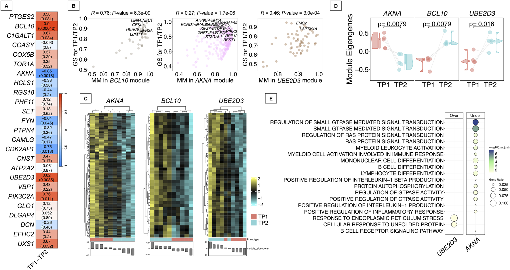 In addition, we further explored the functional roles of the hub genes from the significantly correlated modules (AKNA, UBE2D3 and BCL10) by retrieving the GO terms in which these genes are involved (Supplementary Table S10; Supplementary Figure S2). The AKNA gene is associated with 27 pathways, primarily related to nervous system processes (i.e. neurogenesis, forebrain development or stress response) as well as cell-cell adhesion. UBE2D3 gene participates in 50 pathways, mainly linked to ubiquitination, protein-related catabolic processes and response to BMP and TGF-beta signaling. Finally, BCL10 is involved in 157 pathways, predominantly associated with immune-related functions, cell–cell adhesion, and apoptotic processes.