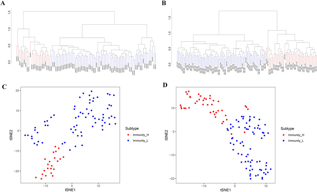 Hierarchical clustering dendrograms and t-SNE plots depicting immunity subtypes. Panels A and B show dendrograms with samples color-coded as red or blue. Panels C and D display t-SNE plots with dots representing two immunity subtypes: Immunity_H in red and Immunity_L in blue, showing distinct clustering patterns.