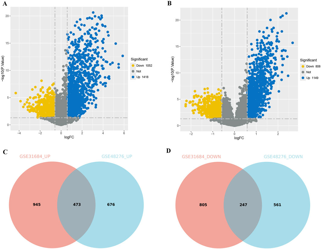 Panel A and B show volcano plots with dots representing gene expression data, differentiated by color: yellow for downregulated, blue for upregulated, and gray for not significant genes. Panel A displays 1,052 downregulated and 1,418 upregulated genes, while Panel B displays 808 downregulated and 1,149 upregulated genes. Panel C is a Venn diagram comparing upregulated genes, showing an overlap of 473 genes between datasets GSE31684 and GSE48276. Panel D is a Venn diagram for downregulated genes, with an overlap of 247 genes between the same datasets.