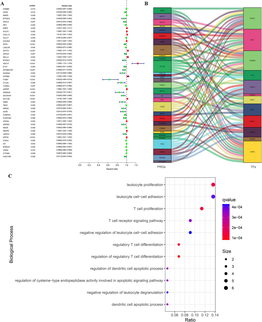 A composite image contains three panels: A, B, and C. Panel A is a forest plot depicting hazard ratios for various genes, with different colors and markers indicating significance levels. Panel B is a Sankey diagram showing connections between predictor genes (PRGs) and transcription factors (TFs), each represented by colored blocks and lines. Panel C is a bubble chart displaying biological processes, with bubbles sized according to significance and colored by adjusted q-values. The horizontal axis represents ratios, while the vertical axis lists biological processes like leukocyte proliferation and T cell functions.