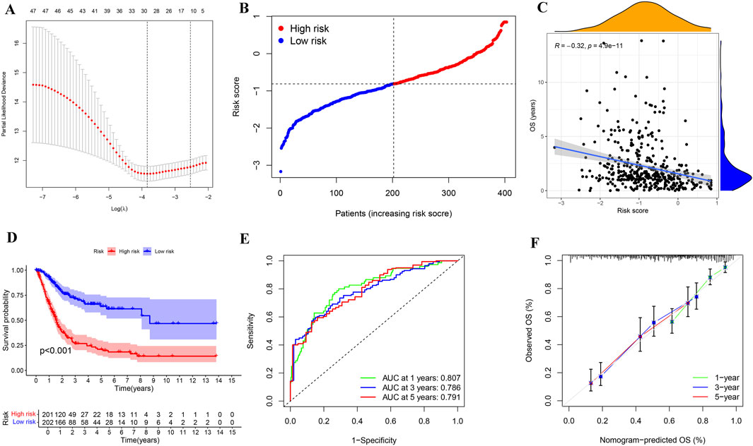 Graphical summary consisting of six panels labeled A to F: A shows a plot of partial likelihood deviance versus Log(λ) with error bars. B displays a risk score plot distinguishing high and low-risk patients. C features a scatter plot with a negative correlation between risk score and overall survival (OS) years. D compares survival probability over time between high and low-risk groups, with significant differences (p<0.001). E is a ROC curve depicting the predictive accuracy at one, three, and five years with AUC values. F presents a calibration curve comparing observed and predicted OS percentages over one, three, and five years.