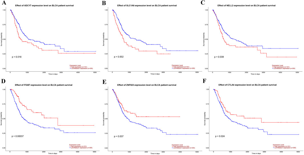 Figure 6. The impact of the expression levels of genes used for risk stratification on the prognosis of BLCA. (A–C) The influence of the expression levels of the three genes with the highest coefficients—ADCY7 (A), SLC1A6 (B), and NELL2 (C)—on the prognosis of BLCA. (D–F) The influence of the expression levels of the three genes with the smallest coefficients—ITGB7 (D), ZNF823 (E), and CTLA4 (F)—on the prognosis of BLCA.