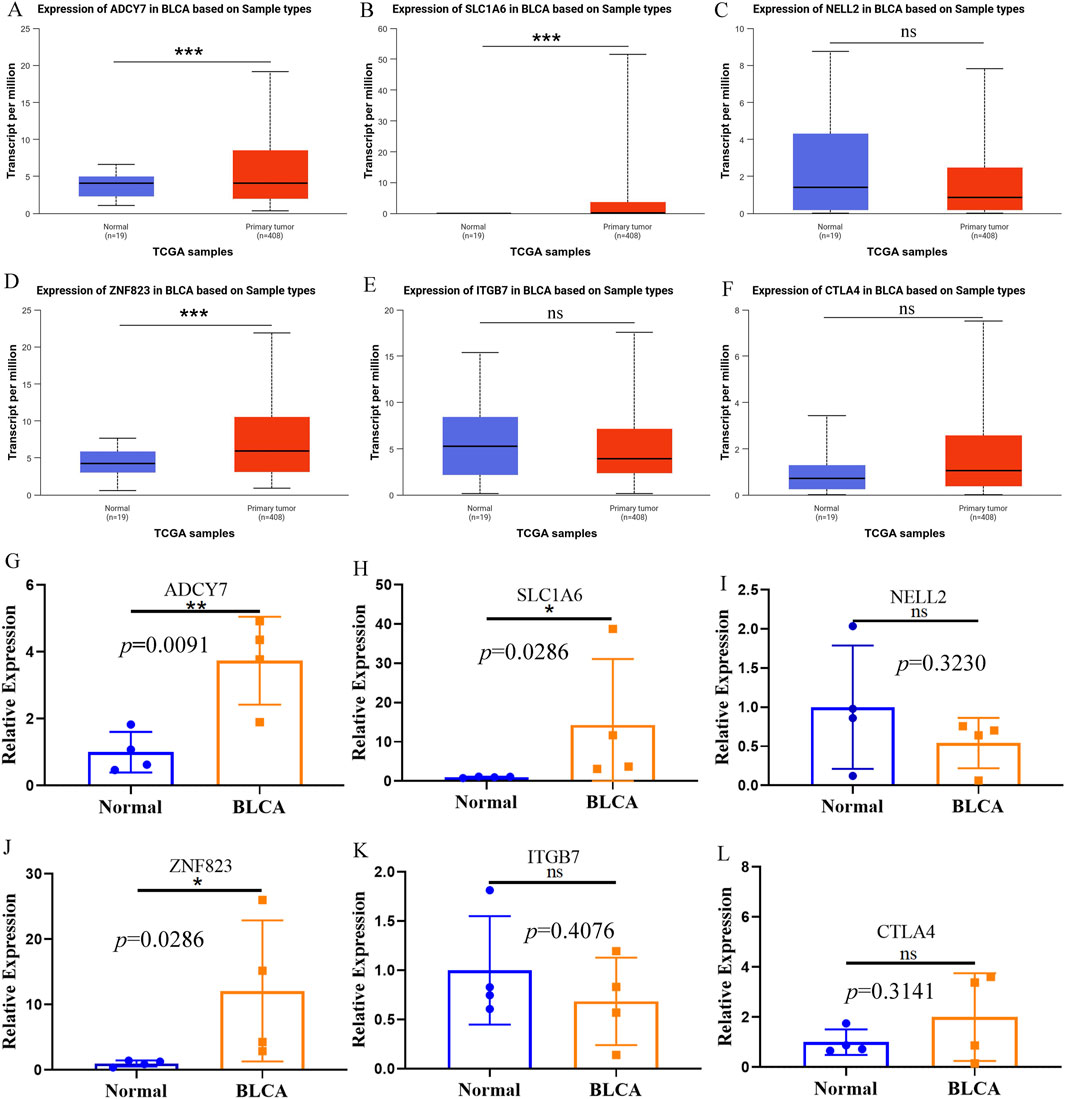 Figure 7. The expression of PRGs in BLCA and adjacent normal tissues. (A–F) The expression of ADCY7 (A), SLC1A6 (B), NELL2 (C), ZNF823 (D), ITGB7 (E) and CTLA4 (F) in BLCA and adjacent tissues in the UALCAN database. (G–L) The qPCR results confirmed the expression of ADCY7 (G), SLC1A6 (H), NELL2 (I), ZNF823 (J), ITGB7 (K) and CTLA4 (L) in BLCA and adjacent tissues. *p < 0.05; **p < 0.01; ***p < 0.001.