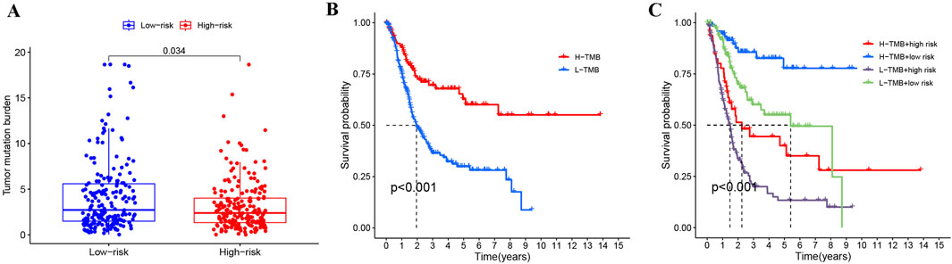 Panel A shows a box plot comparing tumor mutation burden between low-risk (blue) and high-risk (red) groups, with a significant difference at p = 0.034. Panel B presents a Kaplan-Meier survival curve contrasting high-TMB (red) and low-TMB (blue), with a significant p-value less than 0.001. Panel C illustrates survival probabilities for four groups: H-TMB high-risk (red), H-TMB low-risk (blue), L-TMB high-risk (purple), and L-TMB low-risk (green), also showing significant differences.