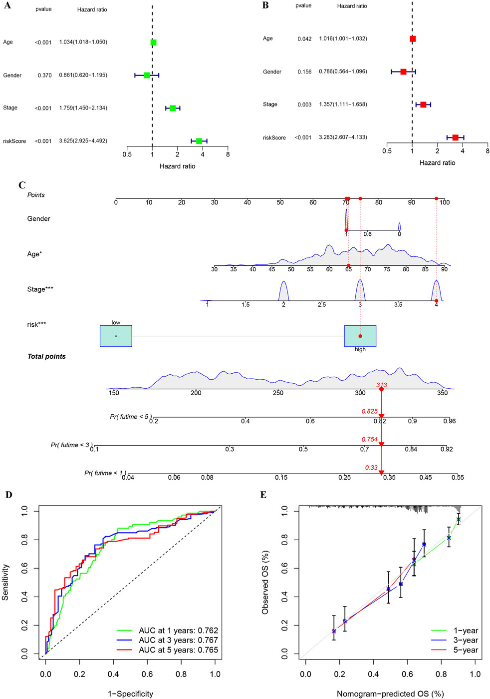 Panel A and B show forest plots of hazard ratios for variables like age, gender, stage, and risk score. Panel C features a nomogram predicting survival probabilities. Panel D displays a ROC curve for survival prediction, with AUC values at one, three, and five years. Panel E presents a calibration plot comparing observed versus predicted overall survival at one, three, and five years.