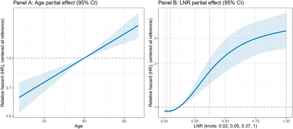 Figure 1. Restricted cubic spline (RCS) partial-effect plots in the modeling cohort. Panel (A) Age; Panel (B) lymph node ratio (LNR). Curves show relative hazard (log scale) centered at the cohort median of each predictor, with 95% confidence bands. Vertical dotted lines indicate RCS knot locations (LNR knots: 0.02, 0.05, 0.37, 1.00). All other covariates were set to their most frequent category within the modeling cohort.
