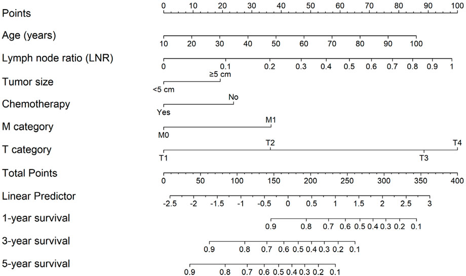 A nomogram was constructed from the reduced cox model (excluding sex and tumor number), in which age entered linearly and LNR was modeled using RCS; tumor size, chemotherapy, T category, and M category were modeled as categorical variables. For each predictor variable, the corresponding point value is read on the top “Points” scale and summed to a “Total Points” score, which maps to the predicted 1-, 3-, and 5-year survival probabilities on the bottom scales (Figure 2).