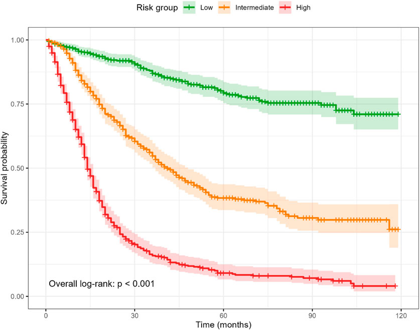 Patients were stratified into low-, intermediate-, and high-risk groups based on tertiles of the nomogram total points. Kaplan–Meier curves demonstrated clear, monotonic separation (log-rank p < 0.001; Figure 3). Median survival was not reached in the low-risk group, while it was 41 months in the intermediate-risk group and 14 months in the high-risk group. Compared with the low-risk group, the hazard ratios for mortality were 3.93 (95% CI, 3.11–4.98) in the intermediate-risk group and 11.50 (95% CI, 9.16–14.45) in the high-risk group.