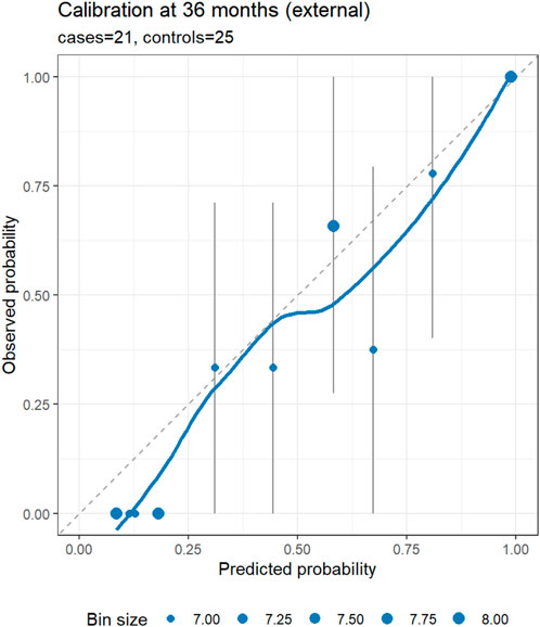 Figure 6. External calibration of the nomogram at 36 months (primary horizon). Points show observed risk (Kaplan–Meier estimate at 36 months) versus predicted risk (1 – S (t | lp)) within bins of predicted risk; vertical bars denote approximate 95% CIs; the dashed line indicates perfect calibration; and the LOESS curve summarizes local trends. The panel subtitle reports the number of cases and controls at the horizon.