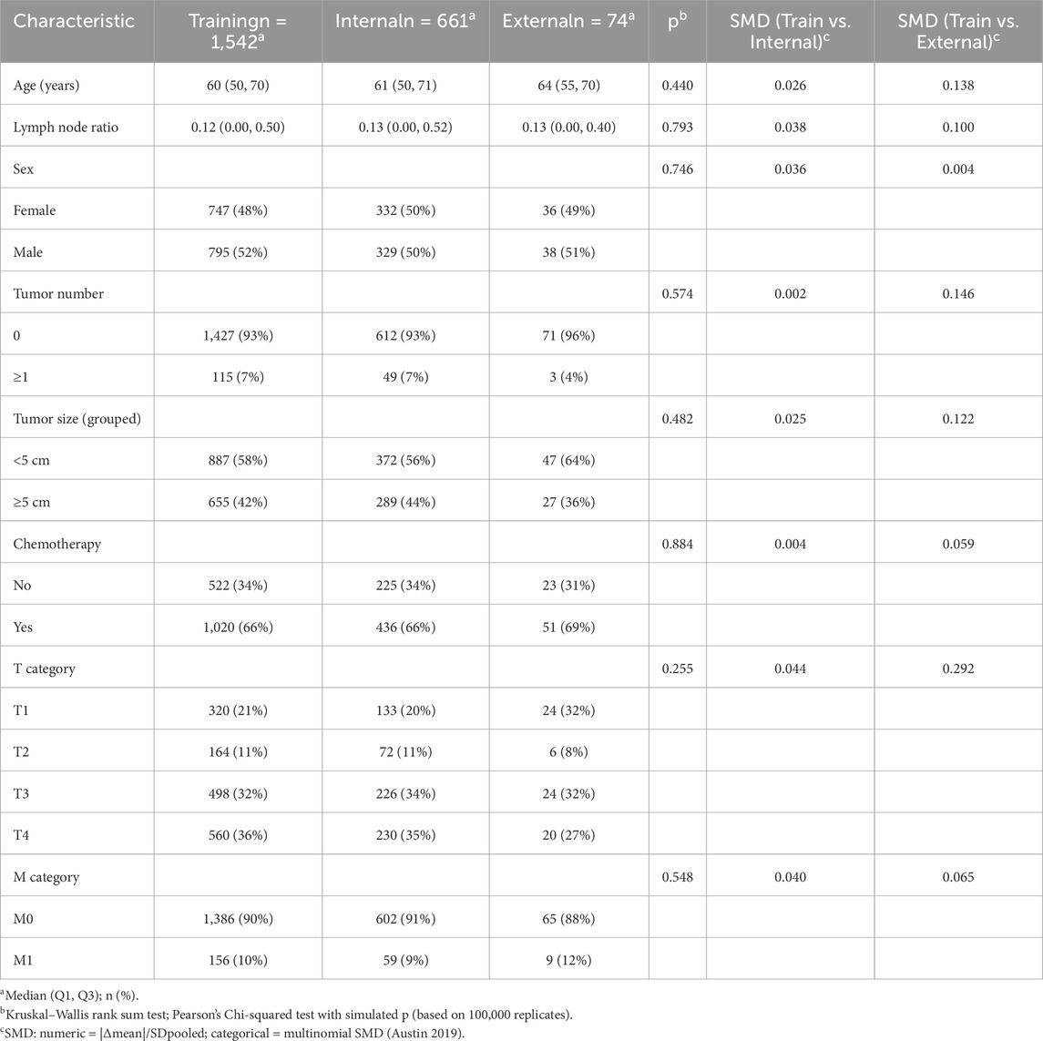 From the SEER database, a total of 2,203 GSRC cases were randomly split into a modeling cohort (70%, n = 1,542) and an internal validation cohort (30%, n = 661). An external cohort of 74 patients from the Second Affiliated Hospital of Nanjing Medical University was used for validation. Baseline characteristics were comparable across cohorts (Table 1).