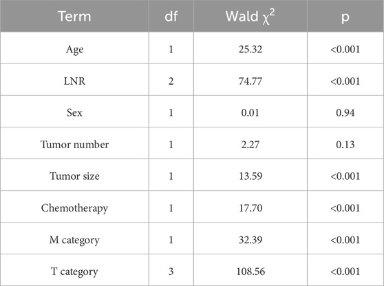 Baseline characteristics were summarized using standardized mean differences (SMDs) and chi-square (χ2) tests. Age and LNR were treated as continuous variables to avoid bias from data-driven cut points. LNR was modeled using restricted cubic splines (RCS) with four knots to capture potential nonlinearity, while age was retained as a linear term. Other variables (sex, chemotherapy, T category, M category, tumor size, tumor number) were entered as categorical factors.
