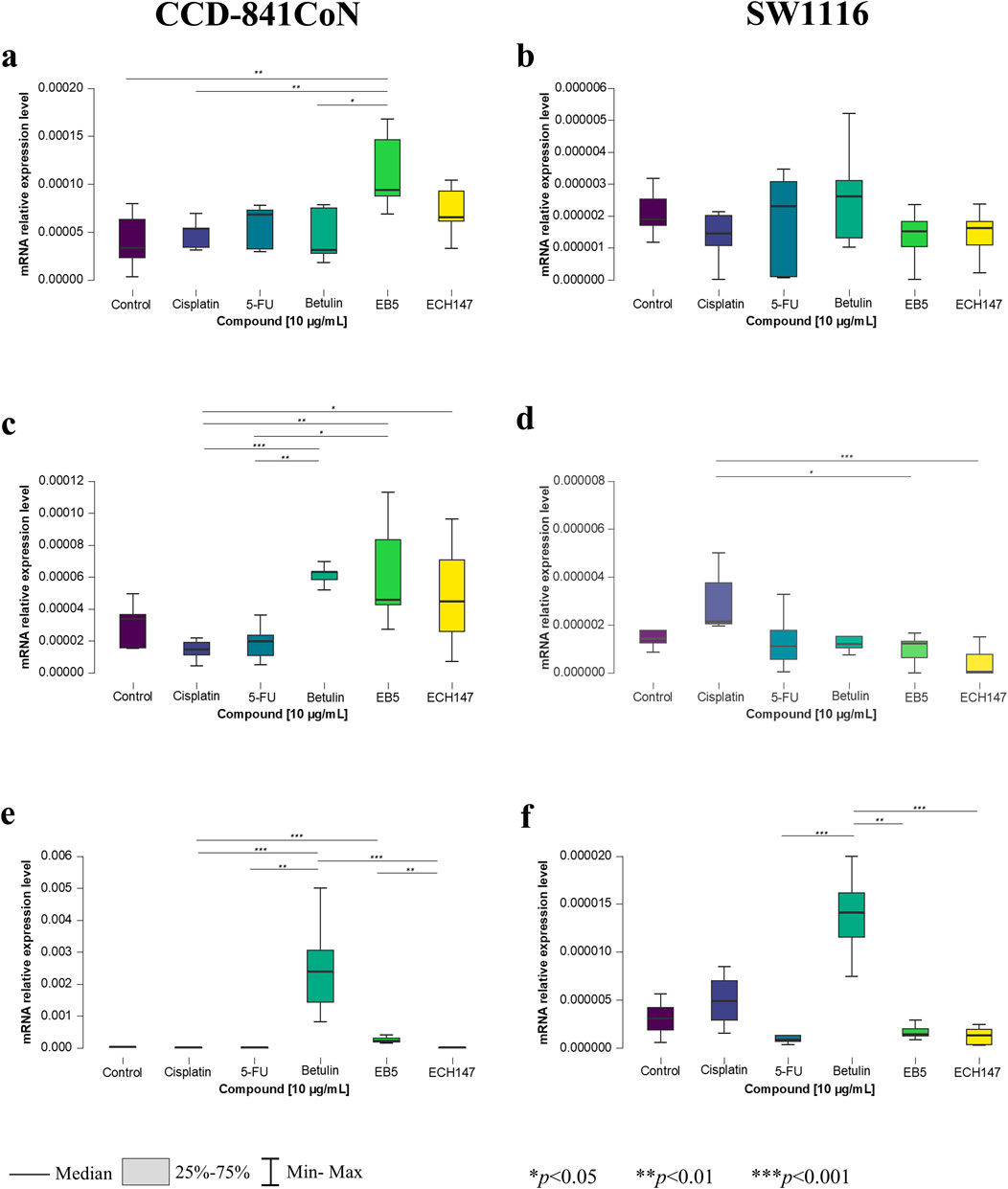 After 24 h of treatment, a shift in IL-6 expression patterns in SW1116 cell line was observed (Figure 1f). A substantial increase in IL-6 mRNA levels was detected following betulin treatment compared to EB5 (p < 0.01), ECH147 (p < 0.001), and 5-FU (p < 0.001). Notably, a marked decrease in IL-6 expression was observed after 24 h of exposure to the derivatives, comparable to levels seen after 5-FU treatment at the same time point. A similar trend was also observed in CCD-841CoN cells (Figure 1e). Statistically significant increases in expression were observed following betulin treatment compared to 5-FU (p < 0.01), cisplatin, and ECH147 (p < 0.001). Additionally, a significant decrease in IL-6 expression was noted after ECH147 treatment compared to EB5 (p < 0.001).