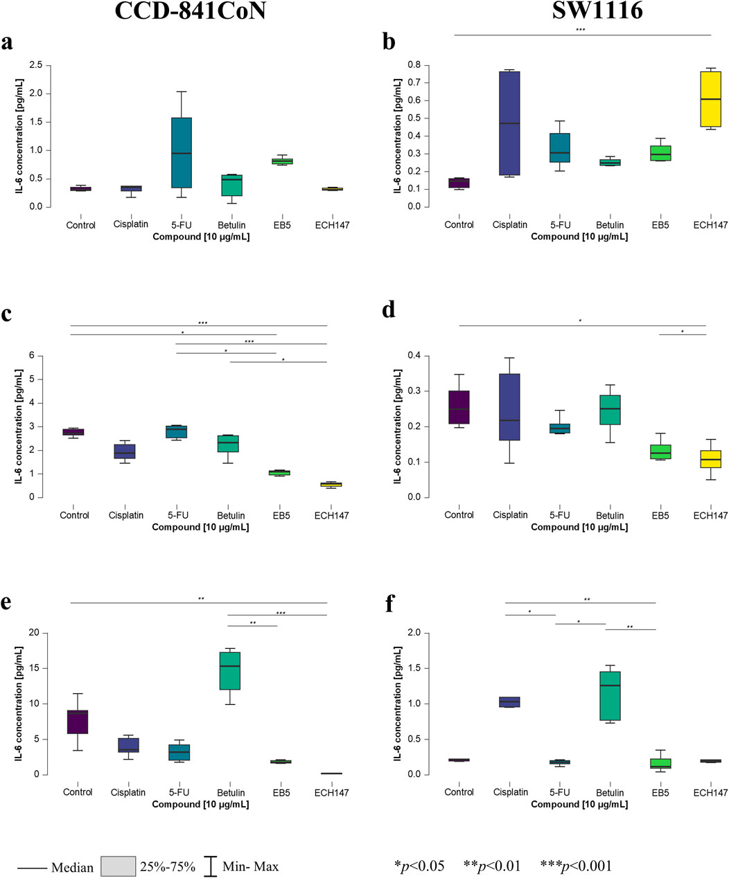 Figure 3. Changes in IL-6 protein concentration in cell culture medium in CCD-841CoN and SW1116 cell lines after 2 h (a,b); 8 h (c,d) and 24 h (e,f) of exposure to the tested compounds. 5-FU—5-fluorouracil; EB5—28-propynoylbetulin; ECH147—29-diethoxyphosphoryl-28-propynoylbetulin; *—p < 0.05; **—p < 0.01; ***—p < 0.001.