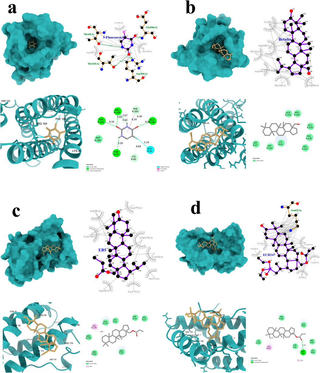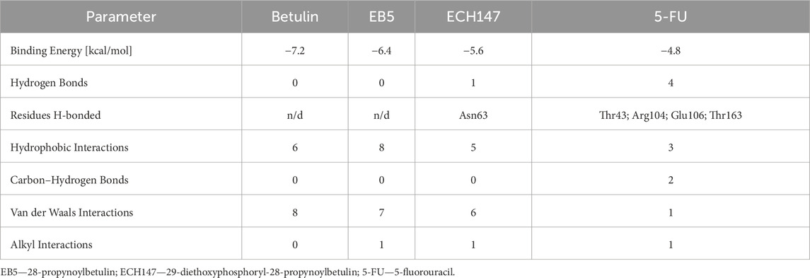 Table 2. Comparative analysis of docking parameters for betulin, EB5, ECH147, and 5-FU with IL-6 protein.