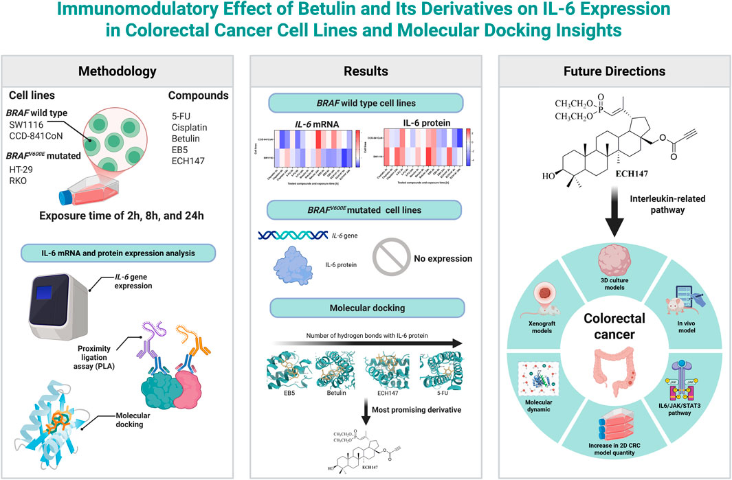 Purpose: This study investigated the immunomodulatory and therapeutic potential of betulin and its derivatives (EB5 and ECH147) in colorectal cancer (CRC), focusing on their effects on IL-6 expression at the molecular level and their possible application as diagnostic and therapeutic tools.