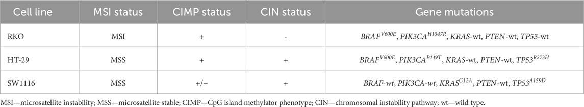 The colorectal cancer cell lines RKO, HT-29, and SW1116 (catalog numbers CRL-2577, HTB-38, and CCL-233, respectively; ATCC, Manassas, VA, United States), along with the normal colon epithelial cell line CCD-841CoN (CRL-1790, ATCC), were cultured under standard in vitro conditions at 37 °C in a humidified atmosphere containing 5% CO2 using a Direct Heat CO2 incubator (ThermoFisher Scientific, Waltham, MA, United States). Each cell line was maintained in its recommended growth medium as per the supplier’s protocol. Specifically, RKO and CCD-841CoN cells were propagated in Eagle’s Minimum Essential Medium (EMEM), HT-29 cells were cultured in McCoy’s 5A medium, and SW1116 cells were grown in Leibovitz’s L-15 medium. All media were supplemented with 10% fetal bovine serum (EuroClone, Milan, Italy) and 50 μg/mL gentamicin (BioWhittaker, Lonza, Basel, Switzerland) to support cell growth and prevent microbial contamination. The main genetic and epigenetic profiles of each CRC cell lines are summarized in Table 1 (Ahmed et al., 2013).