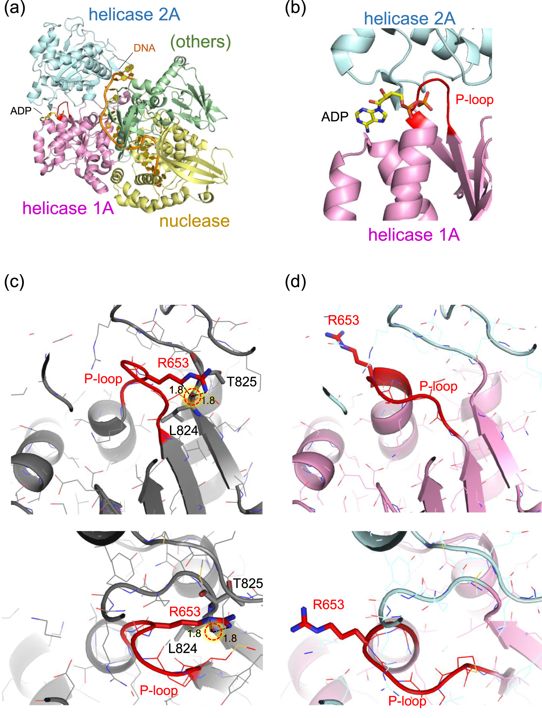 Structure of mouse DNA2 in complex. (a) Overall domain architecture of DNA2 with DNA and ADP (PDB: 5EAX). The helicase domain 1A (magenta), helicase domain 2A (cyan), and nuclease domain (gold) are shown along with bound DNA (orange) and ADP (CPK coloring). Other structural elements, including the oligonucleotide/oligosaccharide-binding domain, α1 domain, barrel domain, and stalk domain, are grouped as “others” (green). (b) Close-up view of the ADP-binding site adjacent to the P-loop (red) in the Walker A motif of helicase domain 1A. (c) Example of an Arg653 conformation while retaining the original (wild-type) P-loop conformation. The Arg653 side chain is positioned too close to the backbone carbonyl oxygen of Leu824 (1.8 Å), resulting in steric clashes. (d) Example of a plausible Arg653 conformation, in which the P-loop adopts a shifted conformation relative to the wild-type structure. The P-loop is shown in red. Major steric clashes are indicated by red dotted circles with labeled distances (Å).