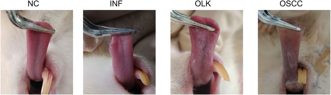 Figure 1. Symptomatic manifestations of the tongue in SD rats at four stages: normal (NC), inflammatory (INF), leukoplakia (OLK), and squamous cell carcinoma (OSCC).