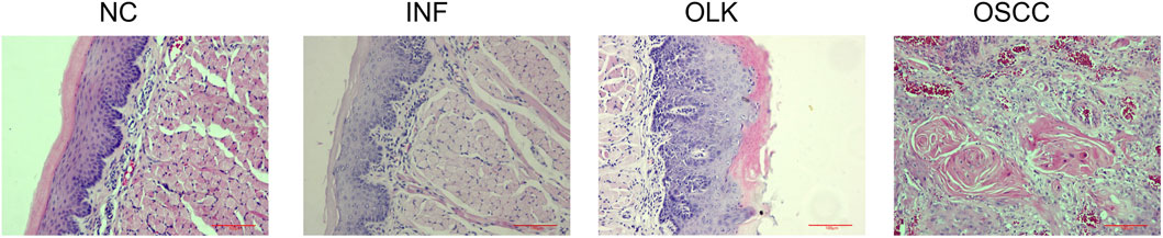 Figure 2. Hematoxylin and eosin staining (×20) of SD rats at four stages: normal (NC), inflammation (INF), leukoplakia (OLK), and squamous cell carcinoma (OSCC).