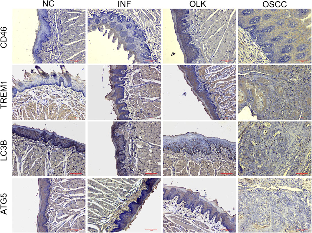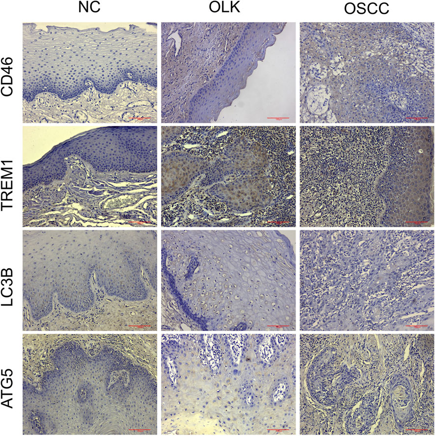 Figure 8. Expression of CD46/TREM1 and LC3B/ATG5 in human normal (NC), leukoplakia (OLK), and squamous cell carcinoma (OSCC) tissues (×20).