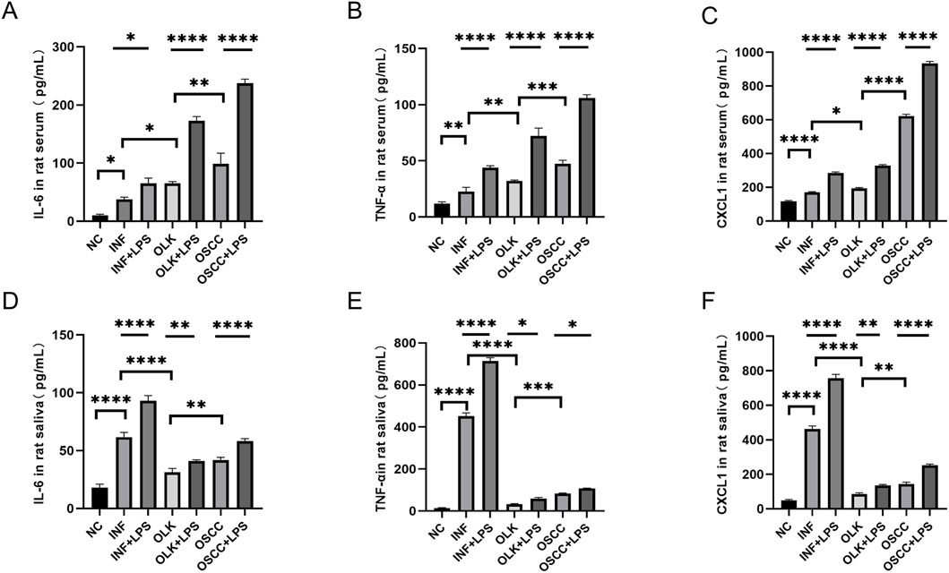 The 4-nitroquinoline-N-oxide (4-NQO) drinking water method established an SD rat model progressing through four stages: normal, inflammatory, leukoplakia, and squamous cell carcinoma. In serum, IL-6, IL-8, and GROα/CXCL1 levels increased sequentially (P < 0.05). In saliva, IL-6, IL-8, and GROα/CXCL1 reached peak concentrations during the inflammatory stage (P < 0.05); the 4-NQO+LPS group exhibited significantly higher inflammatory factors than the 4-NQO group (P < 0.05). These findings indicate that inflammation-to-cancer transition is a critical process in oral carcinogenesis, with chronic inflammation acting as a “promoter” in this pathway (Figures 4A–F).