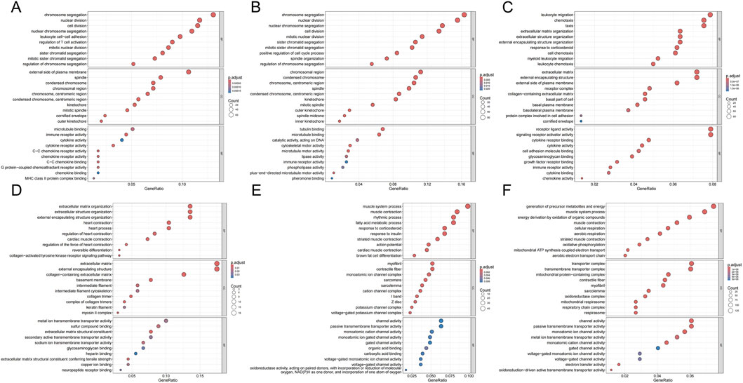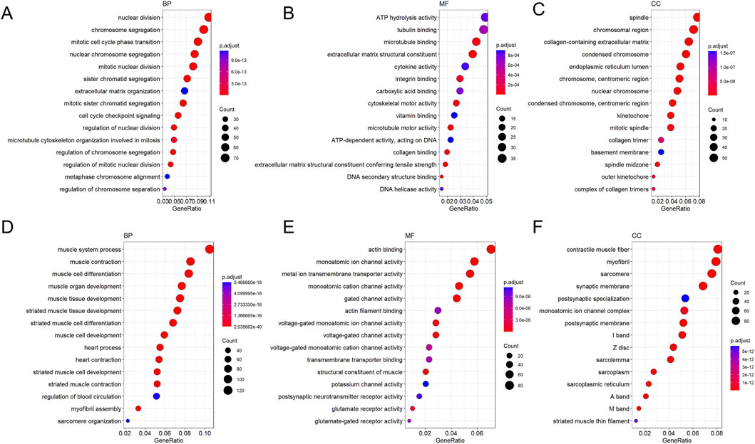 Figure 11. GO enrichment bubble plot of DEGs between OLK and OSCC (the latter as control). Figure (A–C) shows the enrichment plot for downregulated genes, and Figure (D–F) shows the enrichment plot for upregulated genes. The size of the bubble corresponds to the number of genes associated with the GO term, and the color intensity (blue to red) represents the level of enrichment significance.
