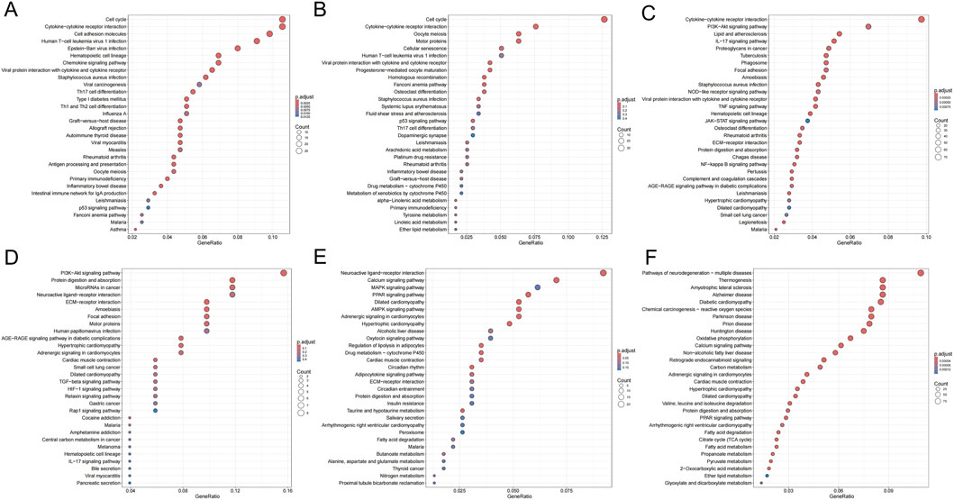 Figure 6. KEGG enrichment bubble plots for DEGs across groups. (A,D) Pathways enriched for genes up- (A) and downregulated (D) in INF compared to NC. (B,E) Pathways enriched for genes up- (B) and downregulated (E) in OLK compared to INF. (C,F) Pathways enriched for genes up- (C) and downregulated (F) in OSCC compared to OLK. For all subfigures, the bubble size represents the number of genes mapped to the KEGG pathway, and the color intensity (blue to red) corresponds to the statistical significance of the enrichment.