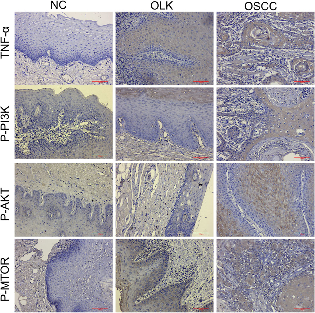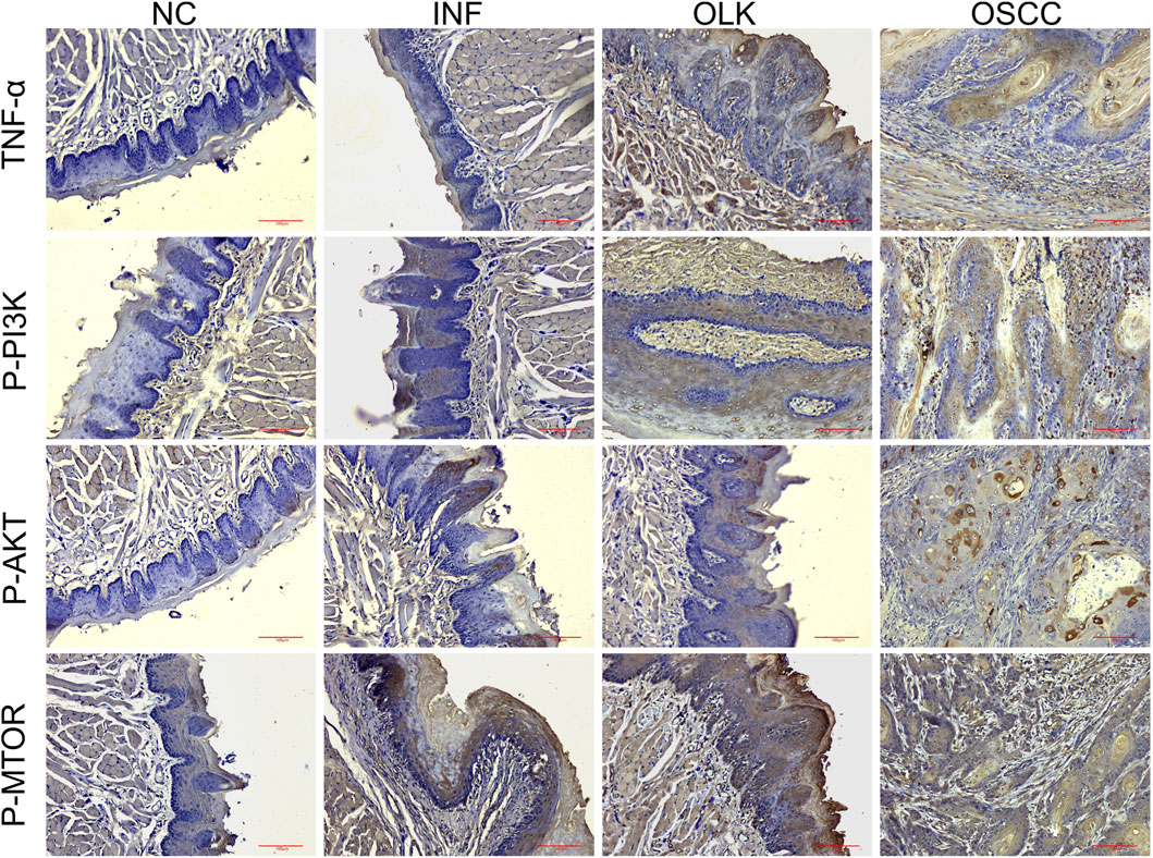 Figure 13. Expression of TNF-α, P-PI3K, P-AKT, and P-MTOR proteins during human oral carcinogenesis (×20).