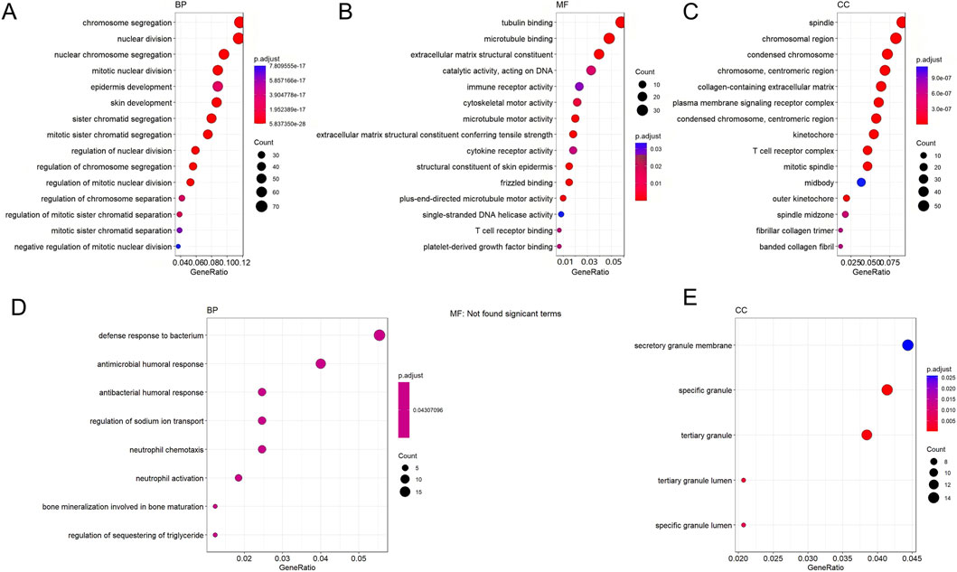 Figure 10. GO enrichment bubble plot of DEGs between NC and OLK (the latter as control). Figure (A–C) shows the enrichment plot for downregulated genes, and Figure (D,E) shows the enrichment plot for upregulated genes. The size of the bubble corresponds to the number of genes associated with the GO term, and the color intensity (blue to red) represents the level of enrichment significance.