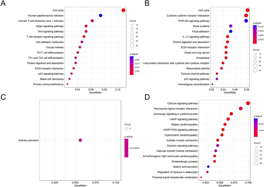 Figure 12. KEGG enrichment bubble plots for DEGs across groups. (A,C) Pathways enriched for genes down- (A) and upregulated (C) in NC compared to OLK. (B,D) Pathways enriched for genes down- (B) and upregulated (D) in OLK compared to OSCC. For all subfigures, the bubble size represents the number of genes mapped to the KEGG pathway, and the color intensity (blue to red) corresponds to the statistical significance of the enrichment.
