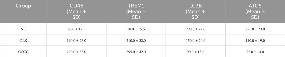 In normal oral mucosa, CD46 is expressed at low to moderate levels, while TREM1 is scarcely expressed. In inflammatory tissue, CD46 expression increases with enhanced membrane staining, and TREM1 is significantly upregulated. A large number of inflammatory cells with mononuclear/polymorphonuclear morphology, along with some epithelial cells, exhibit high expression of TREM1. In both leukoplakia and OSCC tissues, tumor cells exhibited diffuse, strong cytoplasmic/membrane staining. CD46 and TREM1 were highly expressed, while LC3B and ATG5 were expressed at low levels, with these differences being more pronounced in the OSCC group (Figure 3).